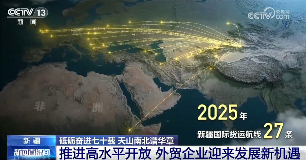 空中航线密集上新,新疆国际货运航线数量从2012年的4条增至27条,联通亚非欧三大洲。