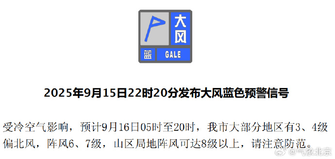 央视网消息:据北京市气象局官方微博消息,北京市气象台2025年09月15日22时20分发布大风蓝色预警信号:受冷空气影响,预计9月16日05时至20时,北京市大部分地区有3、4级偏北风,阵风6、7级,山区局地阵风可达8级以上,请注意防范。