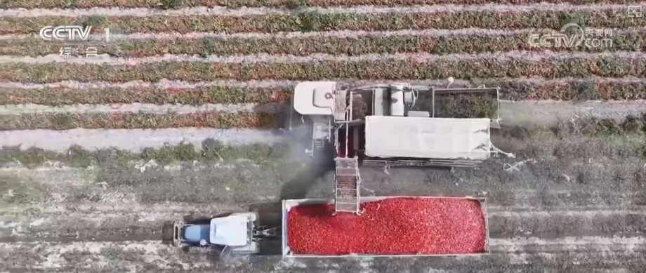 新疆铁门关市的番茄已经大面积成熟。在铁门关市万亩加工番茄种植基地,采收机在田间来回奔忙,将提前采堆成垄的番茄收入机内,经过电子色选仪筛选,剔除未成熟的青色番茄,将成熟的红色番茄用于后期加工。