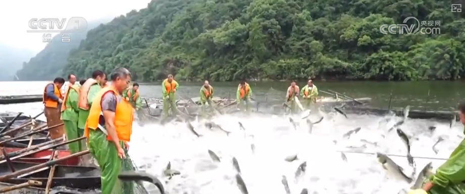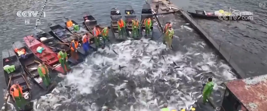 随着巨网不断收窄,网中鱼儿拍打着湖水,上下翻腾,溅起两米多高的水花,场面十分壮观。而在岸边的码头,渔业经销商早已等候多时。刚捕获的大鱼在被分拣、称重后,装进十多辆货车里,趁着新鲜运往全国各地进行销售。