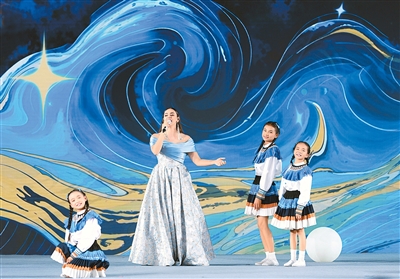 第二届金熊猫国际文化论坛上,大凉山妞妞合唱团、希腊歌手埃里尼(中)和金熊猫少儿艺术团以中英双语演唱歌曲《玉盘》。