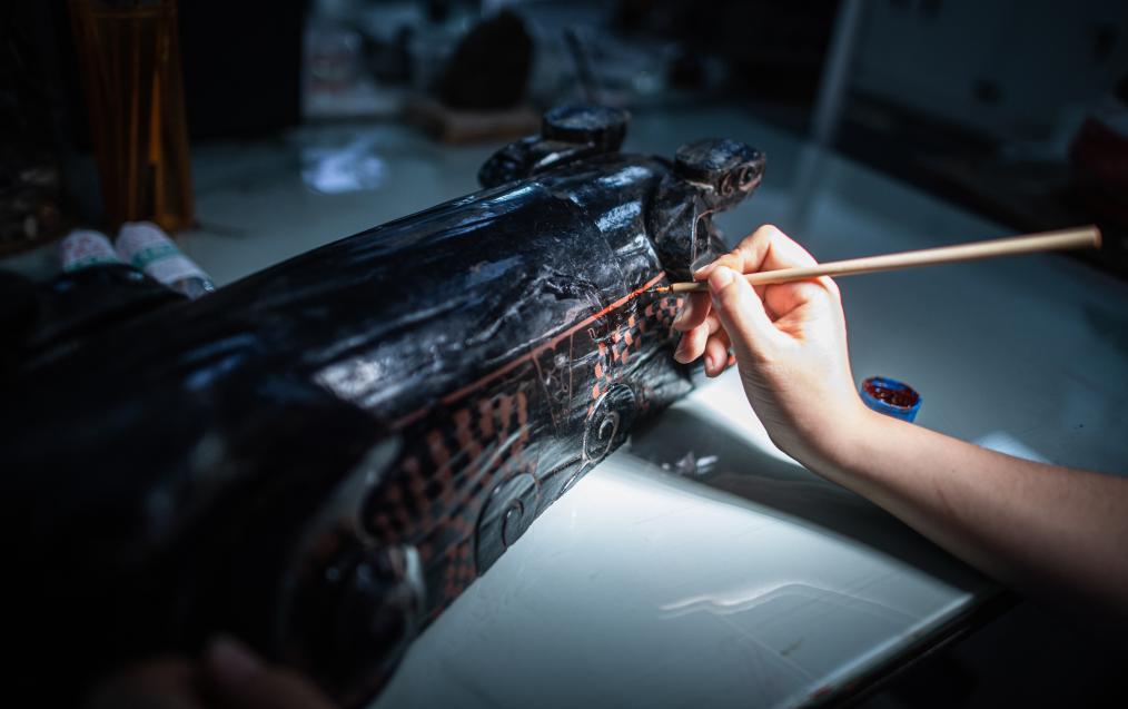 在荆州文物保护中心,文物修复人员修复一件战国兽形酒具盒。新华社记者肖艺九 摄