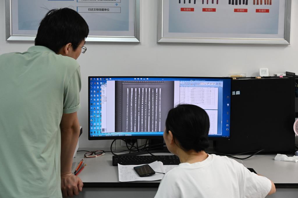 在荆州文物保护中心,工作人员检查扫描后的竹简文字。新华社记者黄晓勇 摄