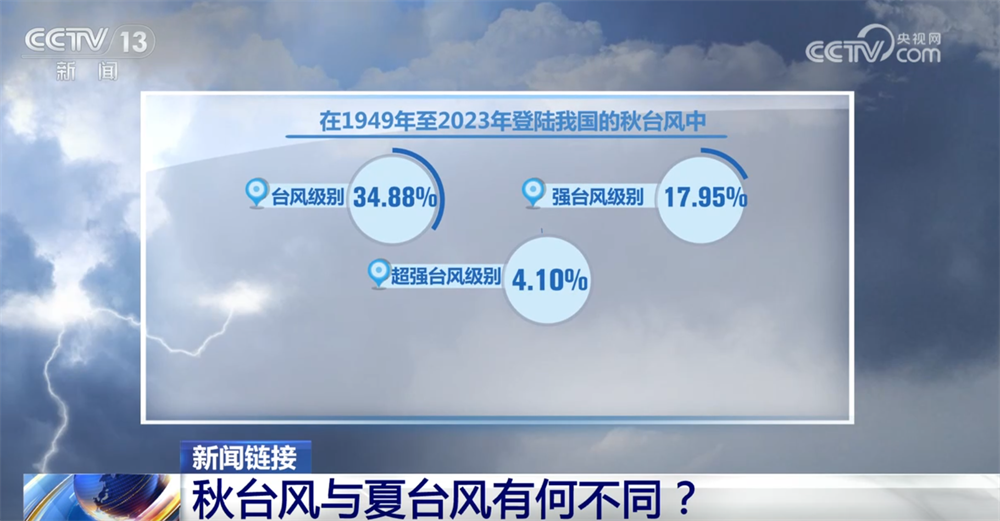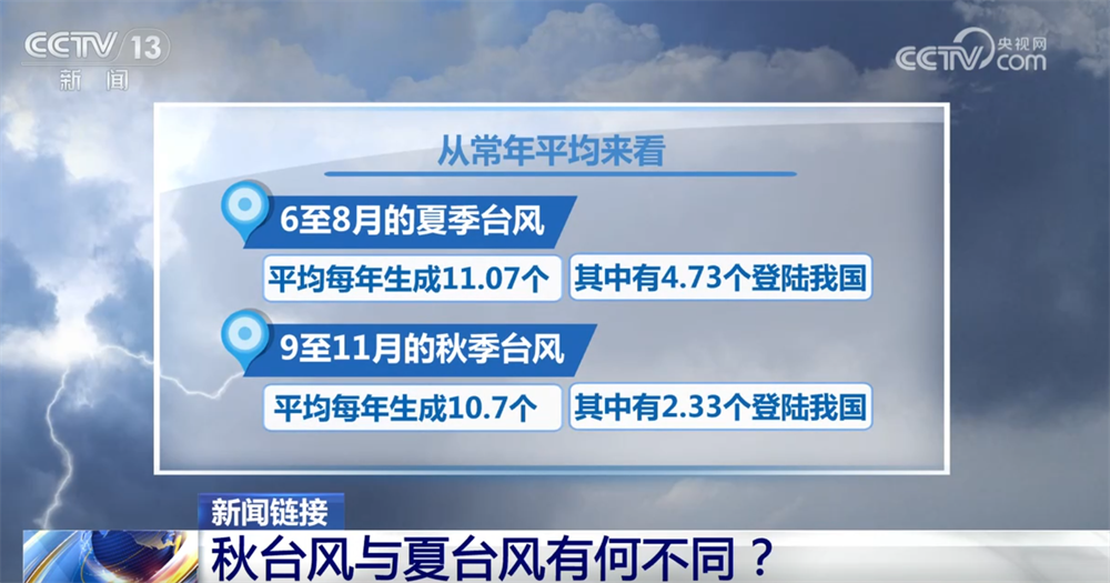 提起台风,大家总是会觉得它是夏季的“特产”。实际上,一年四季都会有台风生成,而登陆我国的台风最早在4月登陆,最晚则在12月才登陆,其中7至9月是台风登陆最频繁的月份,同时也是生成台风个数最多的月份。在气象学上,9月至11月生成的台风被称为“秋台风”,其特点有路径偏南、强度偏强等。从常年平均来看,6至8月的夏季台风,平均每年生成11.07个,其中有4.73个登陆我国。9至11月的秋季台风,平均每年生成10.7个,其中有2.33个登陆我国。秋台风从生成数量上虽然与夏台风基本持平,但登陆我国的秋台风比夏台风明显偏少。在数量上,夏台风略胜一筹。从强度来看,秋台风中有更多“狠角色”。在1949年至2023年登陆我国的秋台风中,34.88%为台风级别,17.95%以强台风级别登陆,4.10%为超强台风级别。