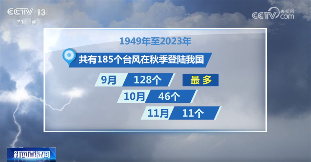 秋台风最“青睐”的登陆地为广东省、海南省、台湾省和福建省。1949年至2023年,共有185个台风在秋季登陆我国,其中9月最多,为128个,10月有46个,而处于深秋的11月也有11个台风登陆。从统计数据看,秋台风最“青睐”的登陆地为广东(72次)、海南(55次)、台湾(45次)和福建(36次)。