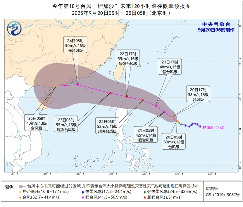 今年第18号台风“桦加沙”于今天(20日)早晨加强为台风级,中心附近最大风力有12级(33米/秒)。预计,“桦加沙”将以每小时10公里左右的速度向西偏北方向移动,强度最强可达超强台风级。“桦加沙”将于22日夜间至23日早晨进入南海,然后趋向我国华南沿海地区。