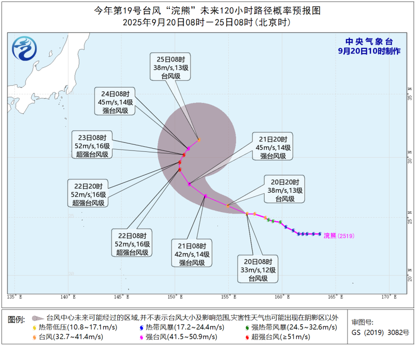今年第19号台风“浣熊”(台风级)的中心今天(20日)上午8点钟位于距离日本东京东偏南方向约1990公里的西北太平洋洋面上,就是北纬25.3度、东经156.7度,中心附近最大风力有12级(33米/秒),中心最低气压为975百帕,七级风圈半径200-280公里,十级风圈半径50-60公里。