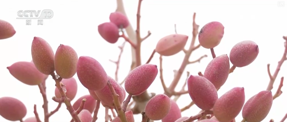 眼下,新疆喀什地区的开心果陆续迎来丰收。果树上挂着一簇簇饱满的果实,在粉红色外皮的包裹下,颗颗开心果如同朵朵花苞即将“绽放”。