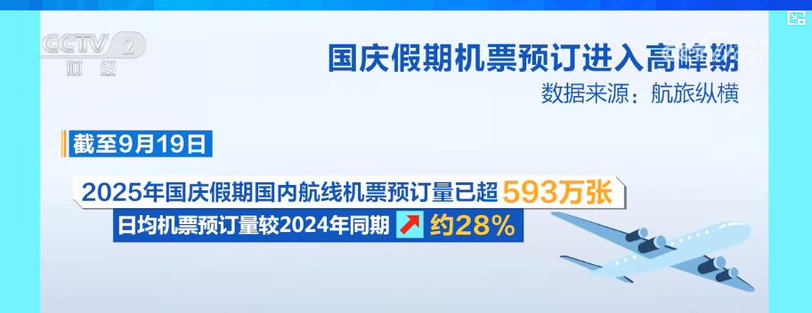 平台数据显示,截至9月19日,今年国庆假期,国内航线机票预订量已超593万张,日均机票预订量较去年同期增长约28%。