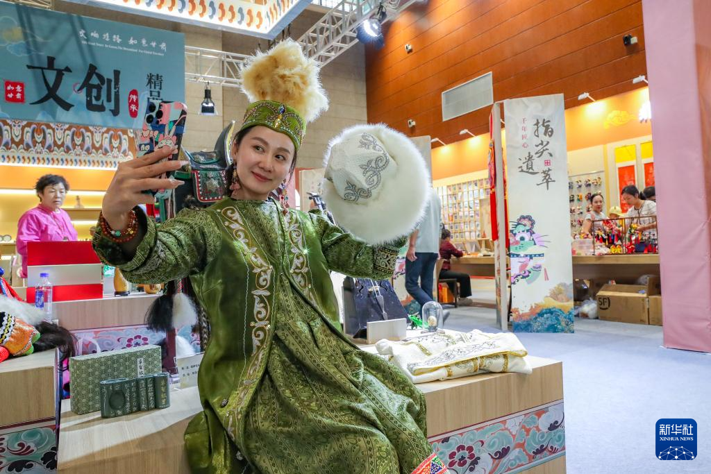 9月22日,游客在敦煌文博会上的一个展览现场身穿民族服饰自拍。新华社记者 郎兵兵 摄