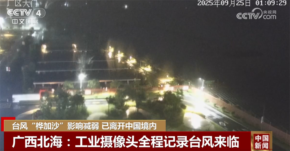 25日凌晨,位于广西北海市的国家能源集团北海电厂的多个工业摄像设备,全过程记录下了台风来临时情况。凌晨1点09分左右,厂区平均风速达15米/秒,瞬时风速达23米/秒,风力达9级。狂风裹着暴雨几乎呈水平方向扫过,摄像头剧烈晃动,镜头不时被密集的雨水完全覆盖,厂区道路已有积水涌动,树木被风吹得持续摇晃。