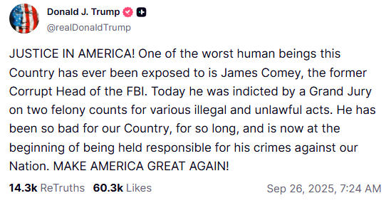 科米被起诉消息公布后,特朗普立即在社交媒体上表示“庆祝”,称科米“长期以来对美国非常坏”,现在“正义终于得到伸张”。就在数天前,特朗普还在社交媒体上发帖,抱怨司法部对科米的调查迟迟没有下文,要求尽快对科米提起诉讼。