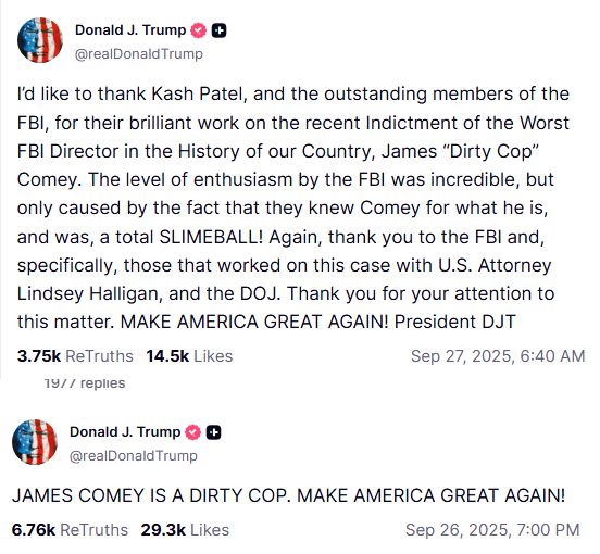 十几个小时后,也许依然意难平,特朗普又发一篇长帖文,把科米形容为“肮脏警察”,“他曾经是、如今还是个彻头彻尾的卑鄙小人”。特朗普同时对现任联邦调查局局长帕特尔的工作表示肯定,并对负责处理本案的相关人员表达感谢。