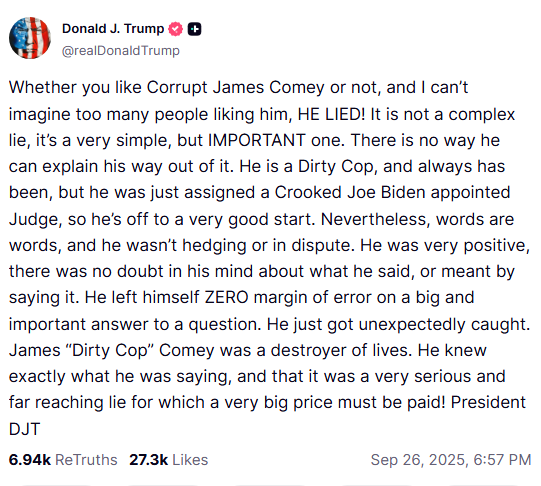 特朗普称,科米“一直都是肮脏警察”,只不过他刚好碰到了由“骗子乔·拜登”任命的法官,所以开局对他来说倒是挺顺利。“然而,话已出口,他当时既没有含糊其辞,也没有提出任何异议。他说得斩钉截铁,对自己说的话以及表达的意思,心里没有丝毫不确定。在回答那个重大且关键的问题时,他让自己没有任何容错空间。他只是没料到自己会被抓包。”