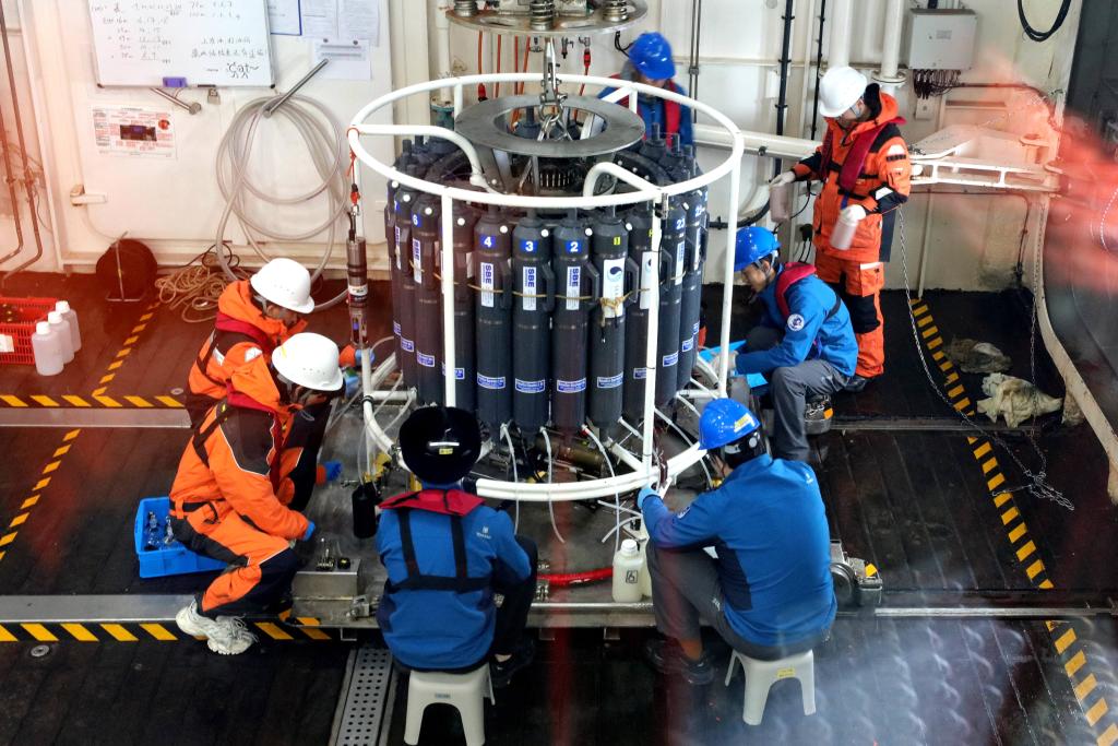 考察队员在“雪龙2”号舯甲板采集CTD(温盐深剖面仪)带回的水样(2025年8月19日摄)。新华社记者 刘诗平 摄