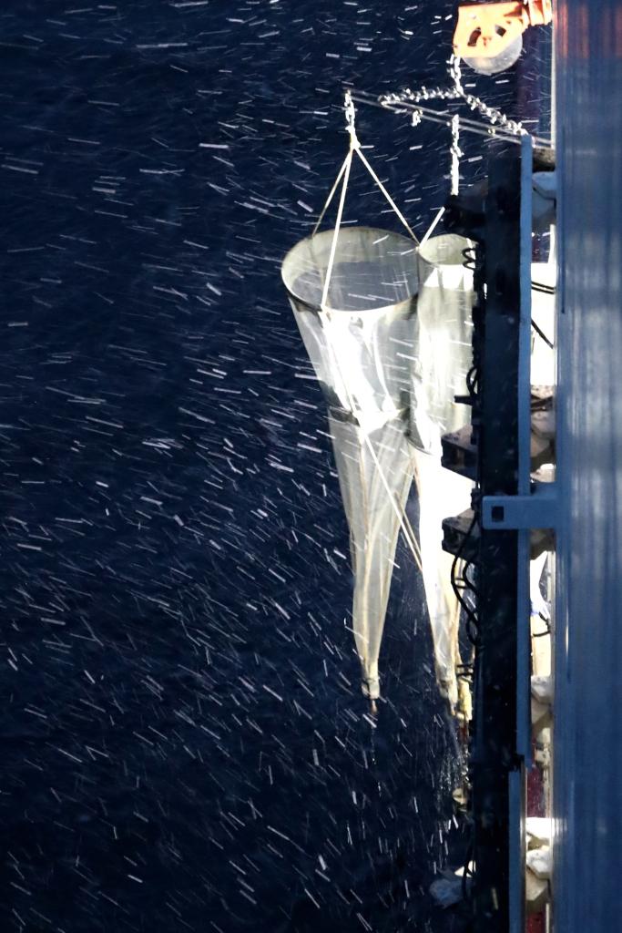 考察队员在“雪龙2”号舯甲板进行回收垂直拖网取样作业(2025年9月8日摄)。新华社记者 刘诗平 摄