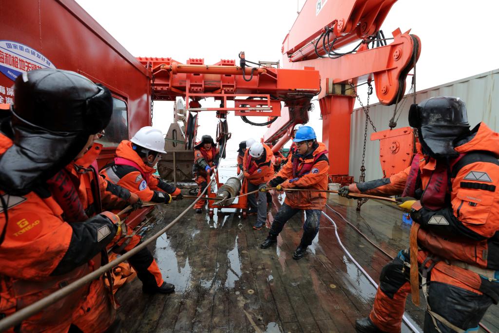 考察队员在“雪龙2”号艉甲板进行重力柱取样作业(2025年8月1日摄)。新华社记者 刘诗平 摄