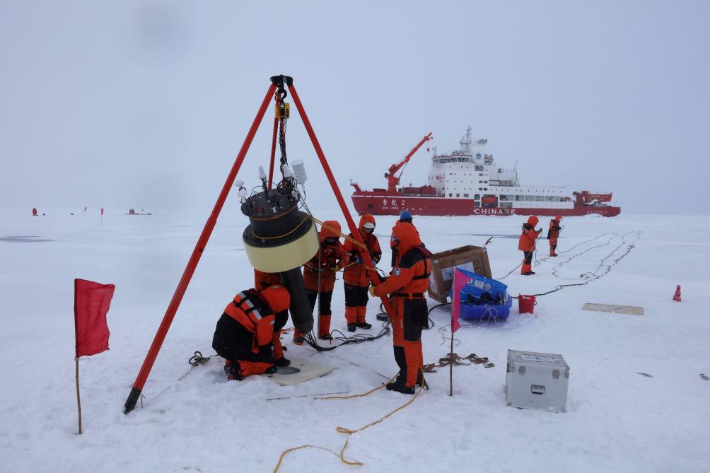 图为考察队员在北冰洋高纬度海域布放冰基浮标。新华社记者刘诗平 摄