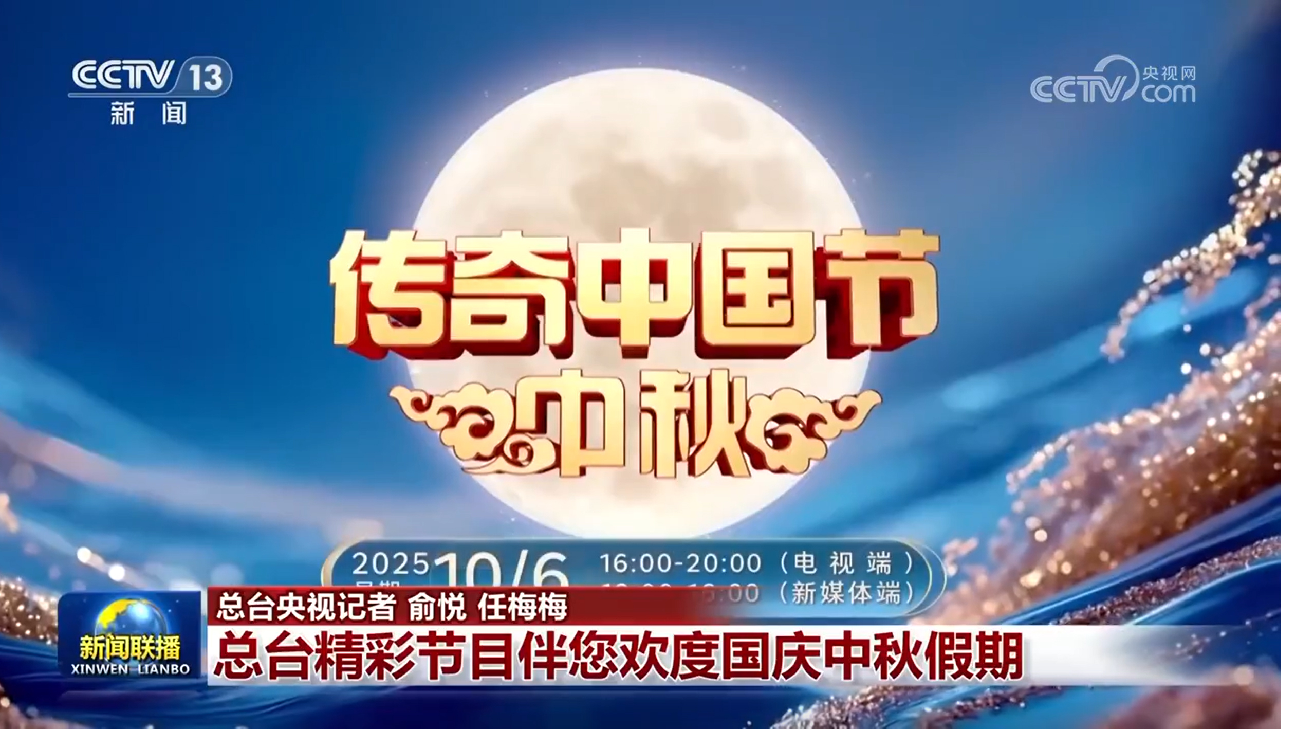 央视网消息(新闻联播):国庆中秋假期,中央广播电视总台各电视频道、广播频率及新媒体平台推出丰富多彩的节目,伴您度过家国团圆、欢乐祥和的双节假期。
