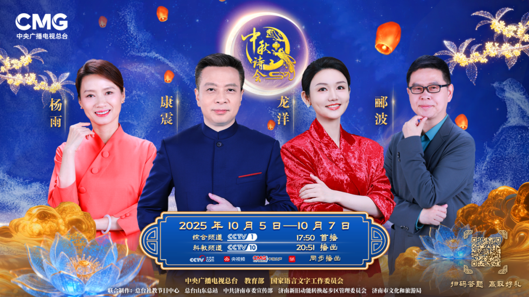 一轮明月照古今,七十二泉涌诗情。由中央广播电视总台、教育部、国家语言文字工作委员会共同主办的《2025中秋诗会》,将于10月5日至7日在央视综合频道(CCTV-1)、央视频、央视网17:50首播;科教频道(CCTV-10)20:51播出;中国之声、云听23:05播出。