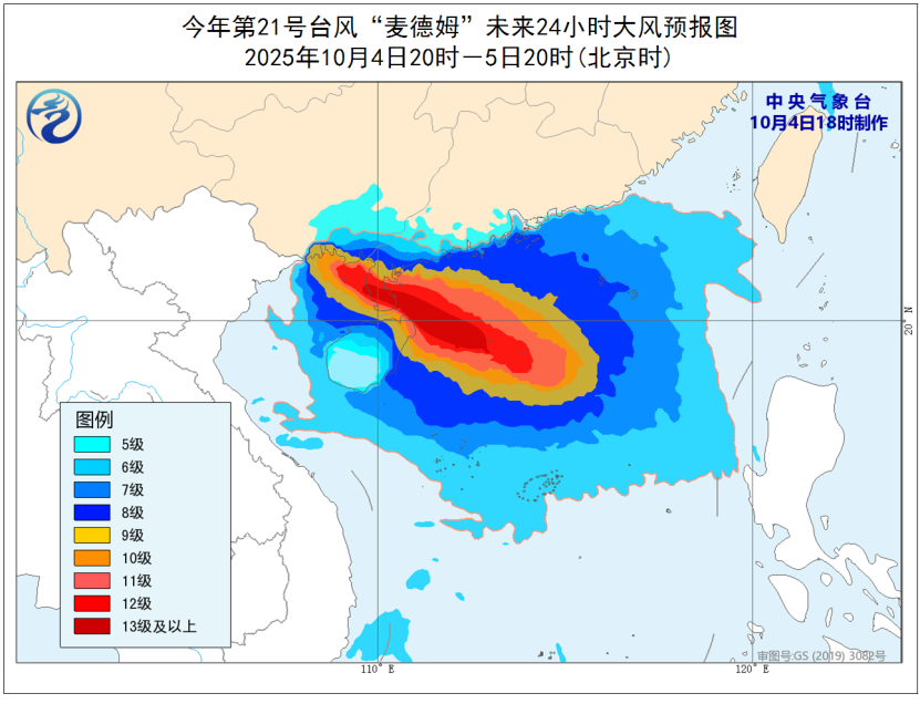 大风预报:4日夜间,巴士海峡、南海北部和中部海域、东沙群岛、西沙群岛、中沙群岛及黄岩岛附近海域、北部湾、台湾岛南部沿海、琼州海峡、广东西部沿海、海南岛沿海有6-8级、阵风9-10级的大风;5日白天,南海西北部海域、琼州海峡、北部湾北部海域、广东西南部沿海、广西沿海、海南岛东部和北部沿海的风力有9-11级,阵风12-13级,部分海域或地区风力可达12-15级,阵风15-17级。