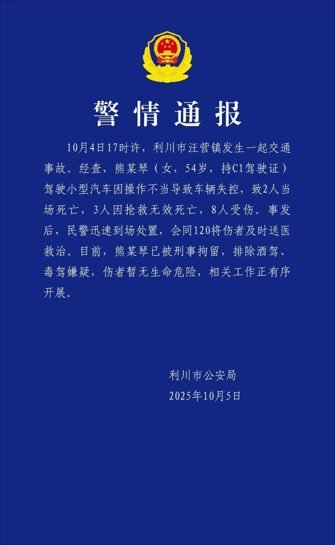 央视网消息:据利川市公安局公众号消息,10月4日17时许,湖北利川汪营镇发生一起交通事故。经查,熊某琴(女,54岁,持C1驾驶证)驾驶小型汽车因操作不当导致车辆失控,致2人当场死亡,3人因抢救无效死亡,8人受伤。事发后,民警迅速到场处置,会同120将伤者及时送医救治。目前,熊某琴已被刑事拘留,排除酒驾、毒驾嫌疑,伤者暂无生命危险,相关工作正有序开展。