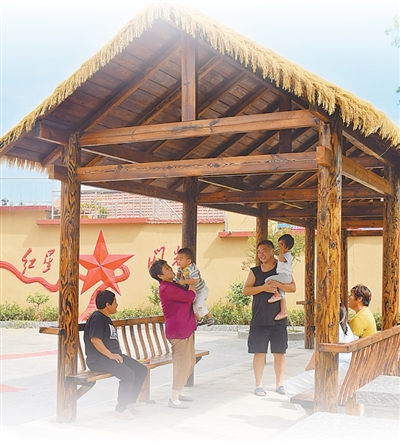 王庄村的儿童在传统民居“干插石头房”门前玩耍。