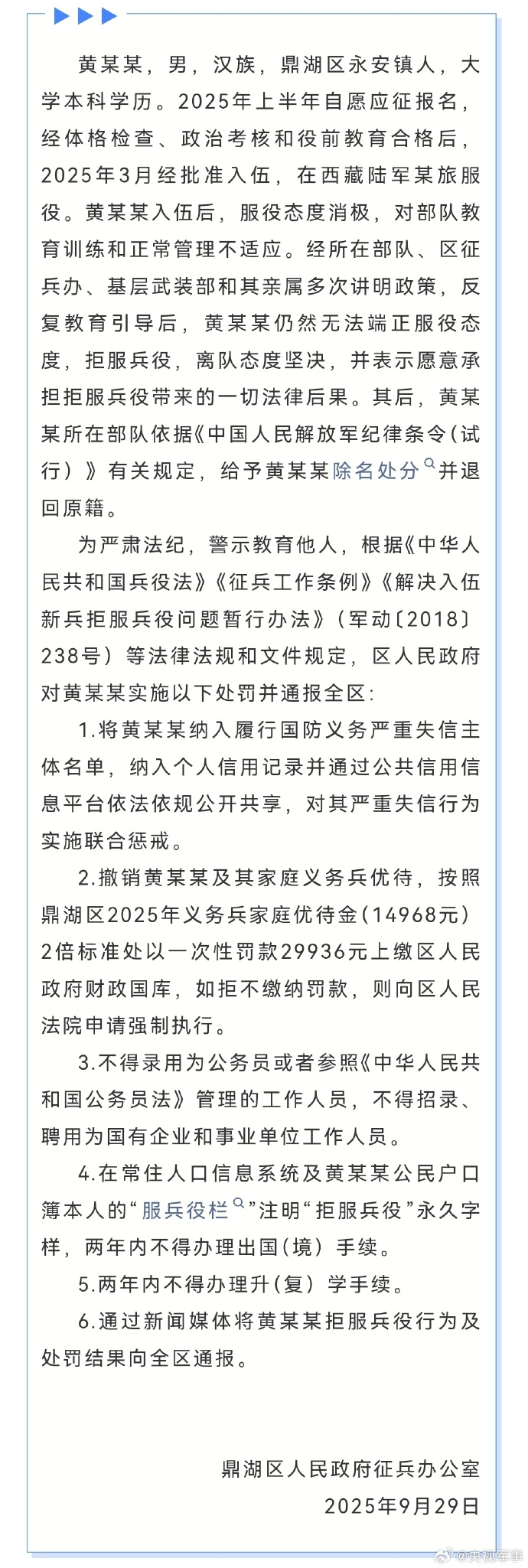 ·拒服兵役,黄某某被部队除名、不得招录为公务员。