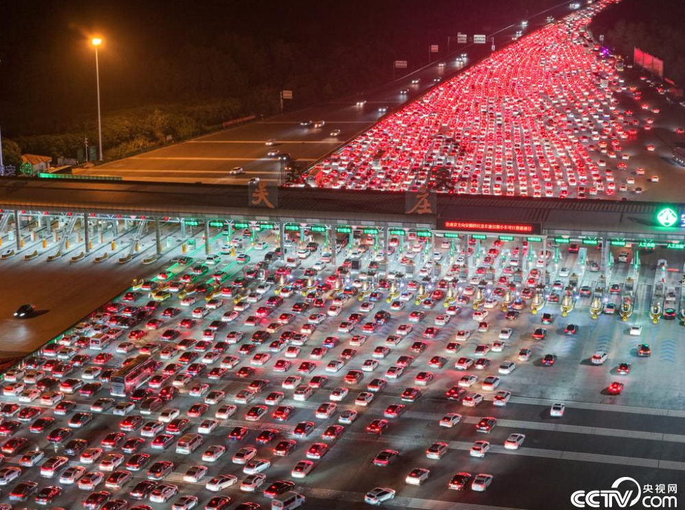 全国最大高速收费站——安徽吴庄收费站迎返程高峰,车辆排成长龙。