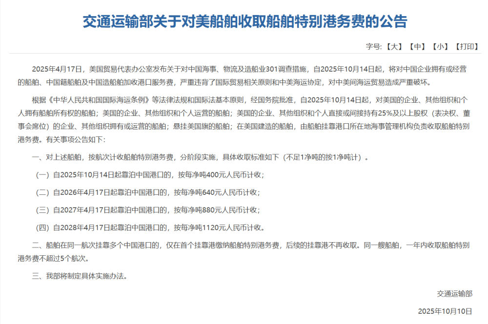 根据《中华人民共和国国际海运条例》等法律法规和国际法基本原则,经国务院批准,自2025年10月14日起,对美国的企业、其他组织和个人拥有船舶所有权的船舶;美国的企业、其他组织和个人运营的船舶;美国的企业、其他组织和个人直接或间接持有25%及以上股权(表决权、董事会席位)的企业、其他组织拥有或运营的船舶;悬挂美国旗的船舶;在美国建造的船舶,由船舶挂靠港口所在地海事管理机构负责收取船舶特别港务费。有关事项公告如下: