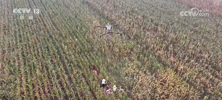 在菏泽定陶区的多块玉米地里,一台台植保无人机搭载着专业的吊装设备往来穿梭,将一袋袋玉米从空中转运到停在地头的运粮车上。