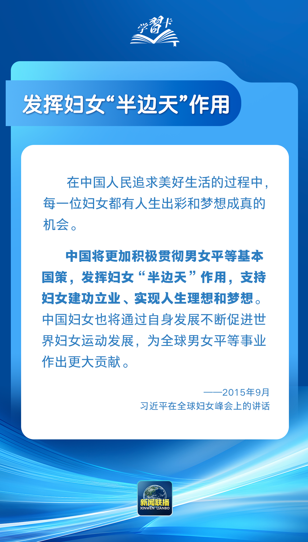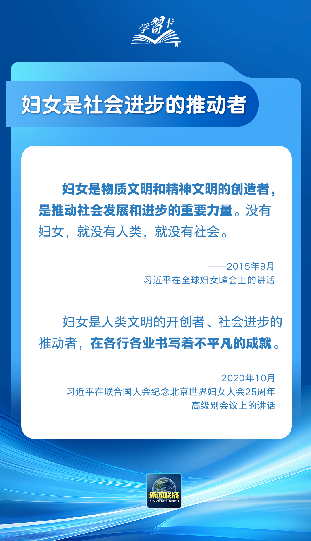 “妇女是人类文明的开创者、社会进步的推动者,在各行各业书写着不平凡的成就。”