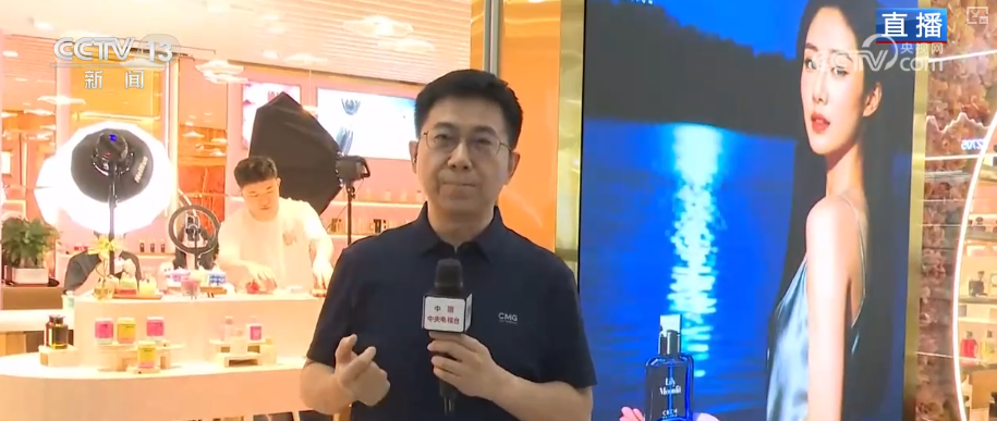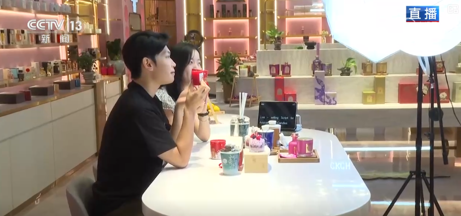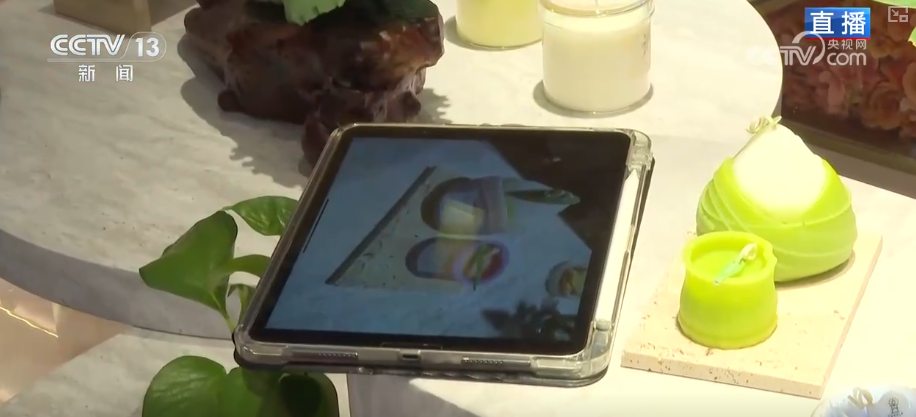 店铺负责人介绍,在这个商场提供了跨境专线服务,他们申请安装后,就可以同时通过多个平台向全球直播带货,这个对他们拓展海外市场和营销宣传很方便。比如这个香薰蜡烛,如果采购商希望看看其他颜色或者不同比例的样品,她只需要拍个图片、输入需求,很快就能生成一张产品的图片很方便。