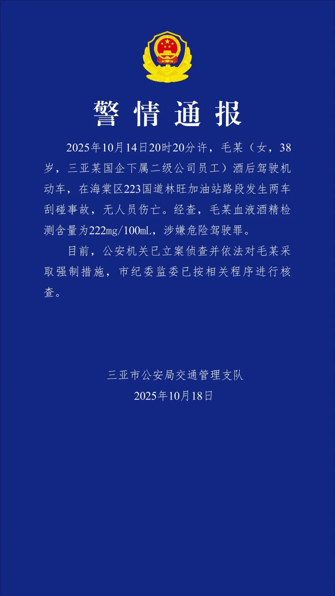 央视网消息:三亚市公安局交通管理支队发布警情通报:2025年10月14日20时20分许,毛某(女,38岁,三亚某国企下属二级公司员工)酒后驾驶机动车,在海棠区223国道林旺加油站路段发生两车刮碰事故,无人员伤亡。经查,毛某血液酒精检测含量为222mg/100ml,涉嫌危险驾驶罪。