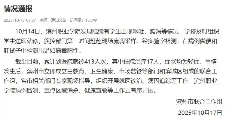 ·山东滨州一学校出现集体腹泻情况,诺如病毒检测为阳性。