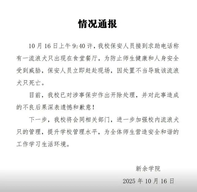 ·江西一高校保安打死校内流浪狗,校方通报:已开除。