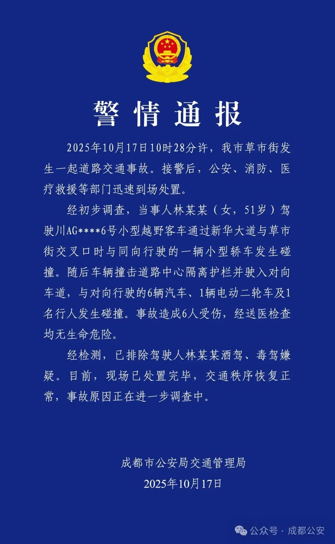 ·警方通报51岁女子撞车致6伤:已排除驾驶人酒驾、毒驾嫌疑。