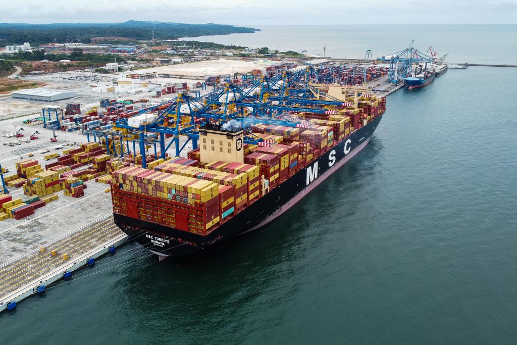 2025年5月9日,货轮停靠在喀麦隆克里比深水港二期码头(无人机照片)。新华社发(科普索摄)