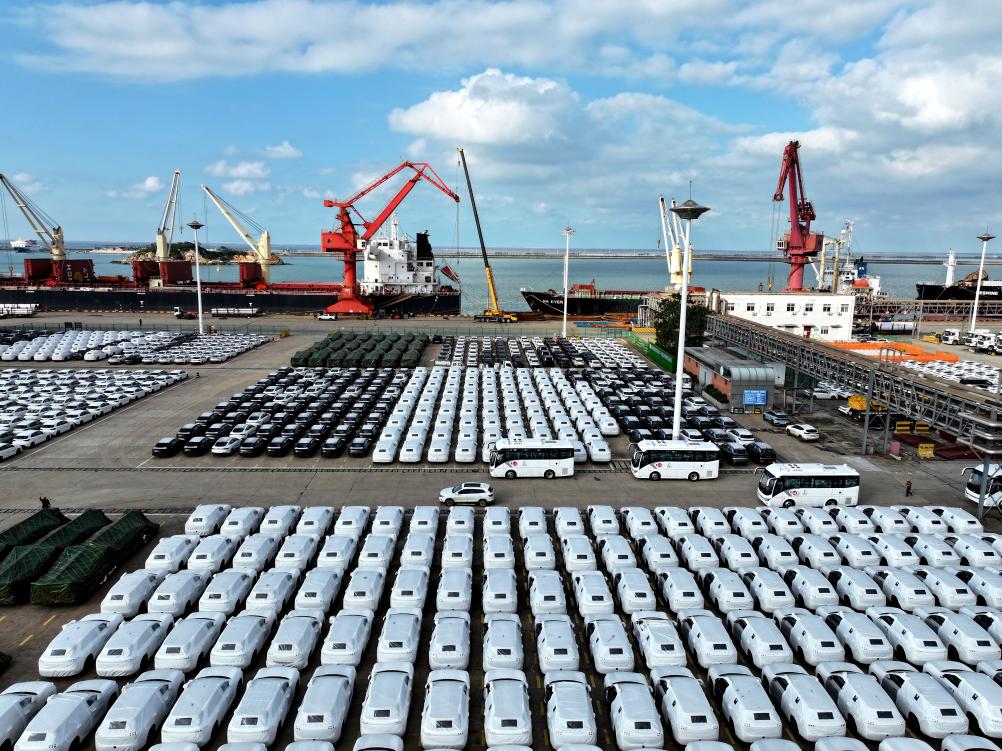 2025年10月14日,在江苏省连云港港东方港务分公司码头,大批汽车准备装船外运(无人机照片)。新华社发(王春摄)