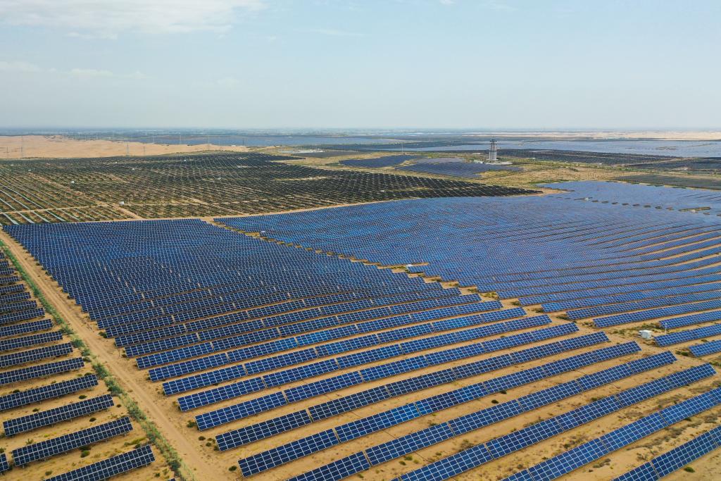 这是2025年9月10日拍摄的位于库布其沙漠的鄂尔多斯市达拉特旗光伏基地(无人机照片)。新华社记者 李志鹏 摄