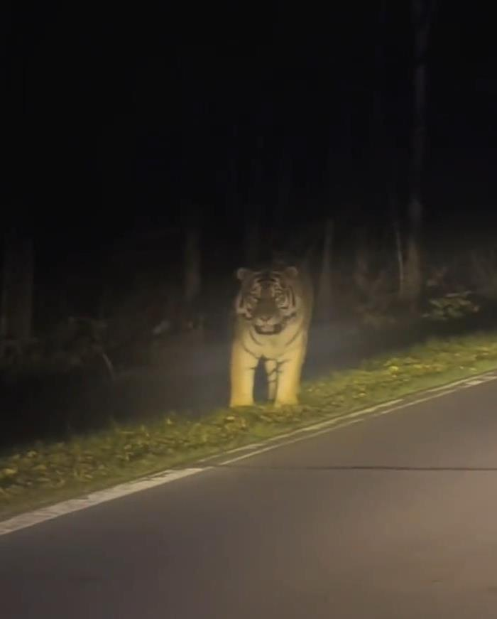 ·吉林延边一男子称在长白山国道夜遇野生东北虎,大喊“本地的”引老虎对视5秒。