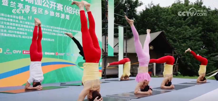 在位于浙江柯桥的兰亭景区,一场瑜伽公开赛正在进行,选手们依次排队上台,完成一系列高难度的瑜伽体式。
