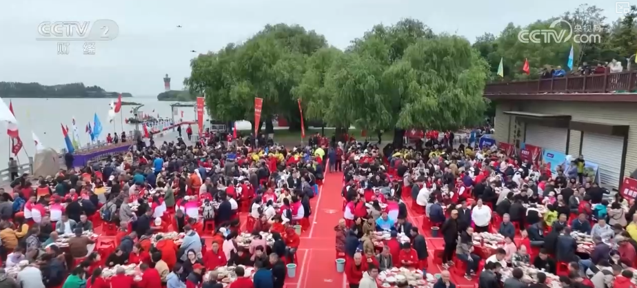 除了激烈精彩的游泳比赛,场地还设置了千人品蟹宴。大家围坐在渔人湾露天观景平台上,一边品尝着膏满黄肥的洪泽湖大闸蟹与淮扬美食,一边欣赏当地特色文艺表演。