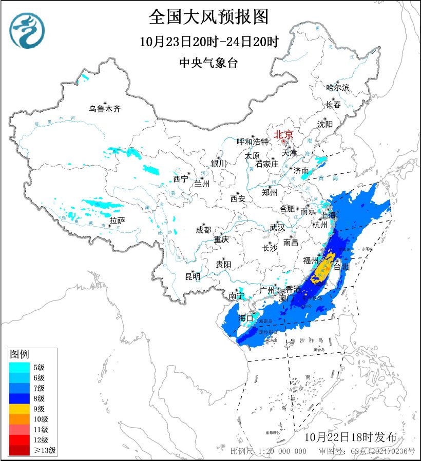10月23日20时至24日20时,山东半岛、江苏南部、安徽南部、福建东部、广西南部、海南岛以及西藏中西部等地部分地区有5~6级风,阵风7~8级;东海大部海域、台湾海峡、台湾以东洋面、南海北部和中西部海域、北部湾将有7~8级、阵风9级的大风,其中台湾海峡的风力可达9级、阵风10~11级。