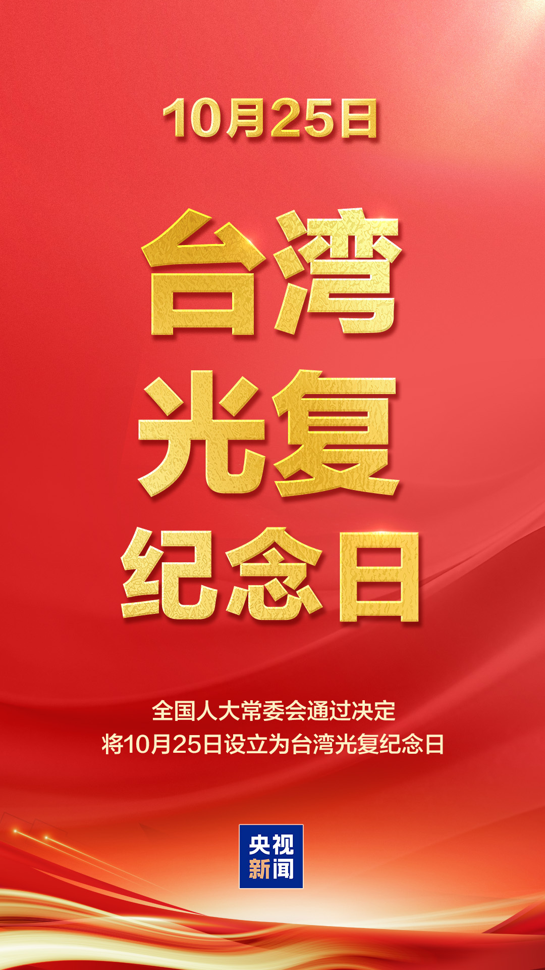 国务院台办发言人陈斌华24日表示,全国人大常委会今天根据宪法作出决定,以法律形式将10月25日设立为台湾光复纪念日,并规定国家通过多种形式举行纪念活动。最高国家权力机关常设机关这一庄严决定,集中反映了包括台湾同胞在内的全体中华儿女的共同心愿和集体意志,是捍卫台湾光复、回归祖国这一重要史实和民族荣光的有力举措。