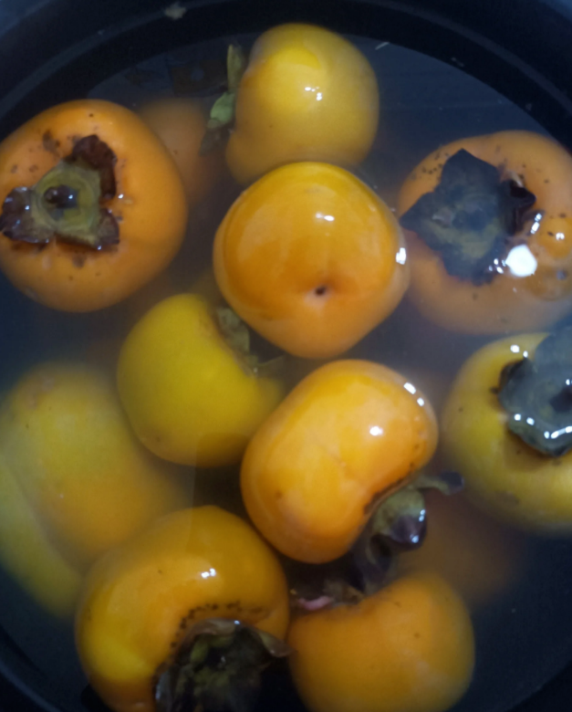 比自然放置稍微快些的办法是将柿子泡在冷水里,每天换水,柿子在无氧呼吸的过程中产生乙醛,有助于可溶性单宁转变成不溶性单宁,几天后就能脱涩了,也可以在水中加入5%左右的生石灰。