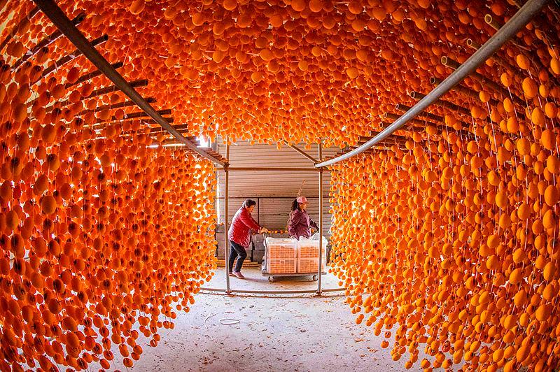 不同地方晒柿饼各有特色,陕西、山东通常将柿子用绳子穿成串,挂起来晾晒。
