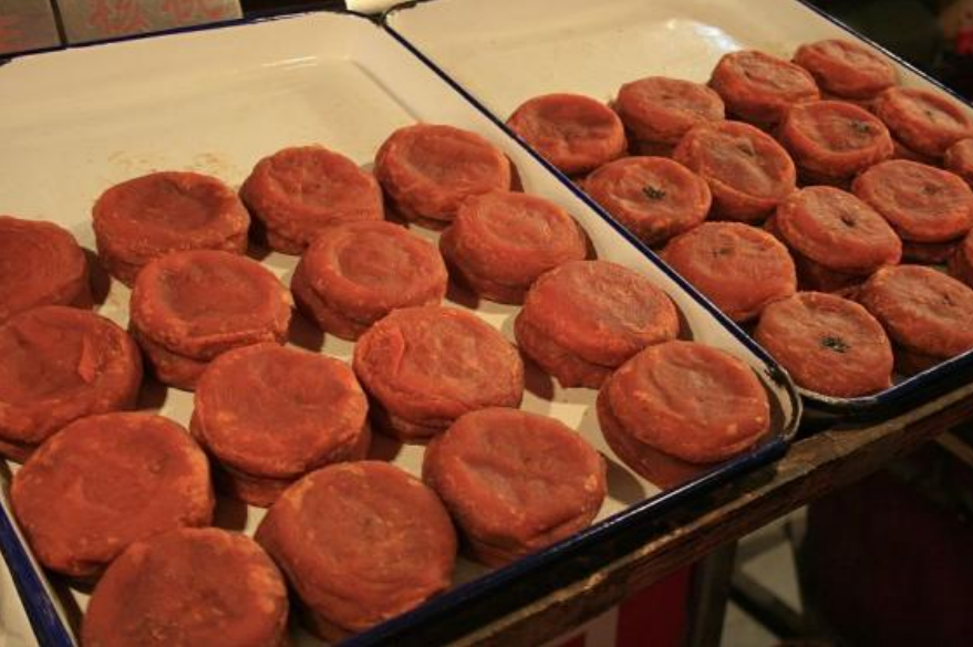 用柿霜做成的糖片是河南荥阳的著名特产,细腻清凉。做柿霜糖的柿霜并不需要老奶奶在柿饼上刮,而是让它溶于水中,过滤掉杂质,再高温蒸发水分,柿霜糖就被熬炼出来了。