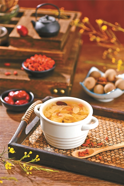百合银耳莲子羹 集润肺、生津、安神于一体。将银耳泡发撕小朵,与百合、莲子一同慢炖至黏稠,可加入适量冰糖或枸杞。可作为下午茶或晚餐后的甜品。