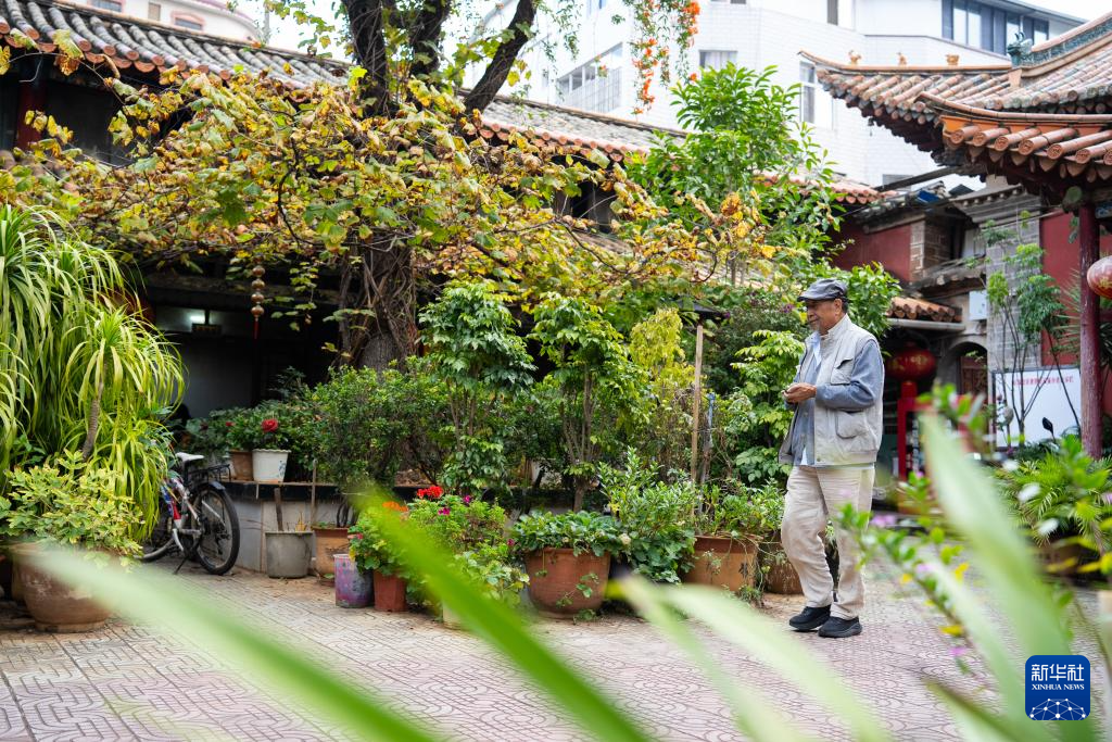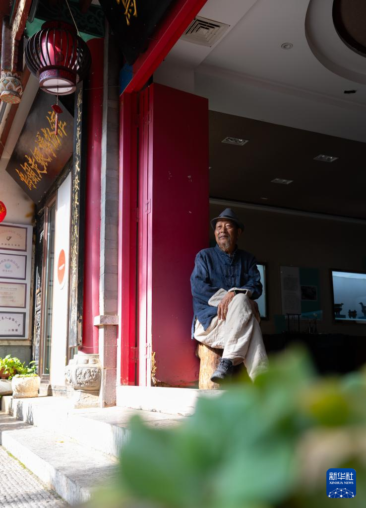10月25日,金永才坐在昆明乌铜走银传习馆门口小憩。新华社记者 高咏薇 摄